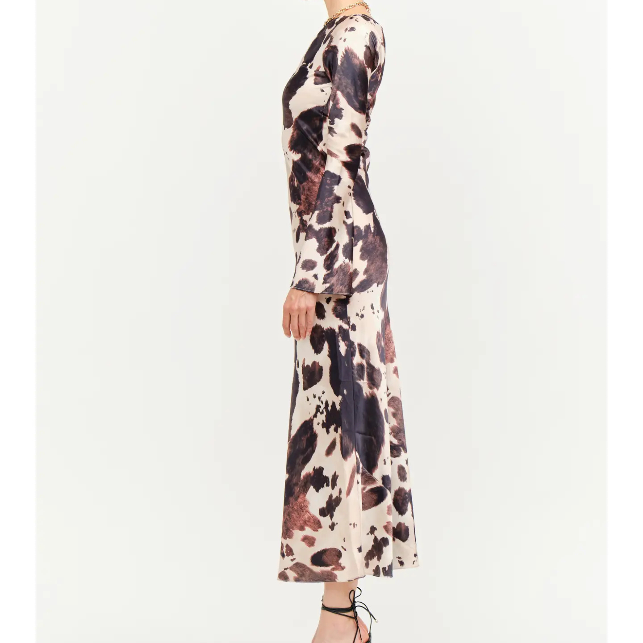 Georgie Cow Dress: Striking and sophisticated, this satin maxi dress is a true showstopper. The bold cow-print pattern meets a sleek, body-skimming silhouette, creating a look that’s equal parts daring and refined. Perfect for evening soirees, gallery openings, or whenever you want to make a statement.
